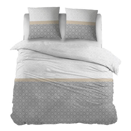 Het Eva flanel dekbedovertrek van Snoozing voegt sfeer toe aan je slaapkamer. Dit overtrek heeft een prachtig dessin met een geometrisch patroon en de kleuren lichtgrijs, donkergrijs en taupe. Het symmetrische patroon bestaat uit rondjes die elkaar overlappen. De lichtgrijze kleur zit aan de bovenzijde van het overtrek en het donkergrijs zit aan de onderkant. Beide kleuren worden van elkaar gescheiden door een taupe-kleurige band. De leuke speling van licht- en donkergrijs zie je ook terug in de bijbehorende kussenslopen.