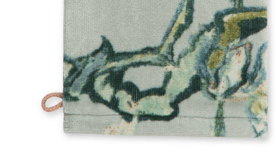 Met het Beddinghouse Blossom badtextiel kies je voor een luxe en artistieke toevoeging in jouw badkamer. Het ontwerp is geïnspireerd op het beroemde schilderij Amandelbloesem van Vincent van Gogh. De sierlijke bloesemtakken komen prachtig uit op de zachtgroene ondergrond. De collectie bestaat uit washandjes, gastendoekjes, handdoeken en douchelakens.