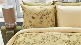 Met het Charlotte dekbedovertrek van Beddinghouse voeg je eenvoudig kleur en elegantie toe aan jouw slaapkamer. Op het okergele dessin staan prachtige olijfgroene takken met bloemen eraan. De takken zijn sierlijk over het overtrek geschilderd. Hier en daar vliegt er een vlinder tussendoor. Ben je na een tijdje toe aan iets anders? Draai het overtrek om en droom heerlijk weg onder de effen zacht gele achterzijde. Of creëer een luxe omslag met de achterzijde.