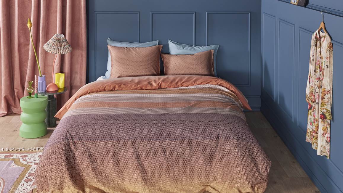 Het Beddinghouse Leo dekbedovertrek geeft je slaapkamer een trendy make-over. Dit geometrische dessin is opgebouwd uit verschillende banen. Hierbij zorgen de terra kleurtinten voor een prachtig kleurverloop. Ze sluiten perfect op elkaar aan en creëren een stijlvol geheel. Om het plaatje af te maken zie je ook op de bijbehorende kussenslopen een heel subtiel grafisch patroon.