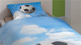 Het Good Morning Bal dekbedovertrek is geweldig voor de fanatieke voetballers. De voetbal op het overtrek ligt al klaar voor de wedstrijd. De blauwe lucht met wolken lijkt de buitenlucht naar binnen te halen en zorgt zo voor een frisse uitstraling. Op de bijpassende kussensloop zie je de bal het doel in schieten. Met het Bal overtrek droomt jouw kleine sporter van het overwinnende doelpunt!