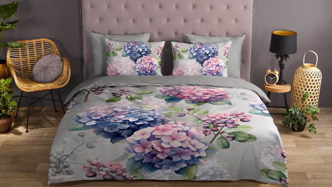 Val iedere avond heerlijk in slaap met het Good Morning Julia dekbedovertrek. Op het grijze dessin staan prachtige hortensia's afgebeeld. De bloemen nemen mooie roze en blauwe tinten aan, waardoor er een fleurig geheel ontstaat. De achterzijde van het overtrek en de bijbehorende kussenslopen zijn effen grijs van kleur. Hiermee kun je leuk combineren of een luxueuze omslag creëren.