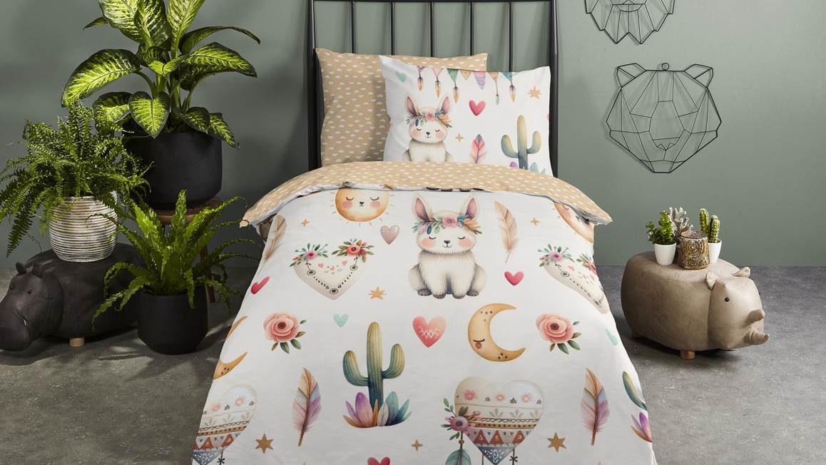 Geef de kinderkamer een sfeervolle touch met het Good Morning Luz dekbedovertrek. De voorkant van het overtrek bestaat uit een print van onder andere cactussen, tipitenten en vosjes. Deze zijn getekend in zachte tinten die prachtig uitkomen op de witte ondergrond. Hierdoor ziet het ontwerp er kleurrijk, maar toch ook rustgevend uit. De achterkant bestaat uit een stippenprint op een zandkleurige ondergrond. Wissel leuk af tussen beide prints. Het Luz dekbedovertrek komt prachtig tot zijn recht in de moderne kinderkamer.
