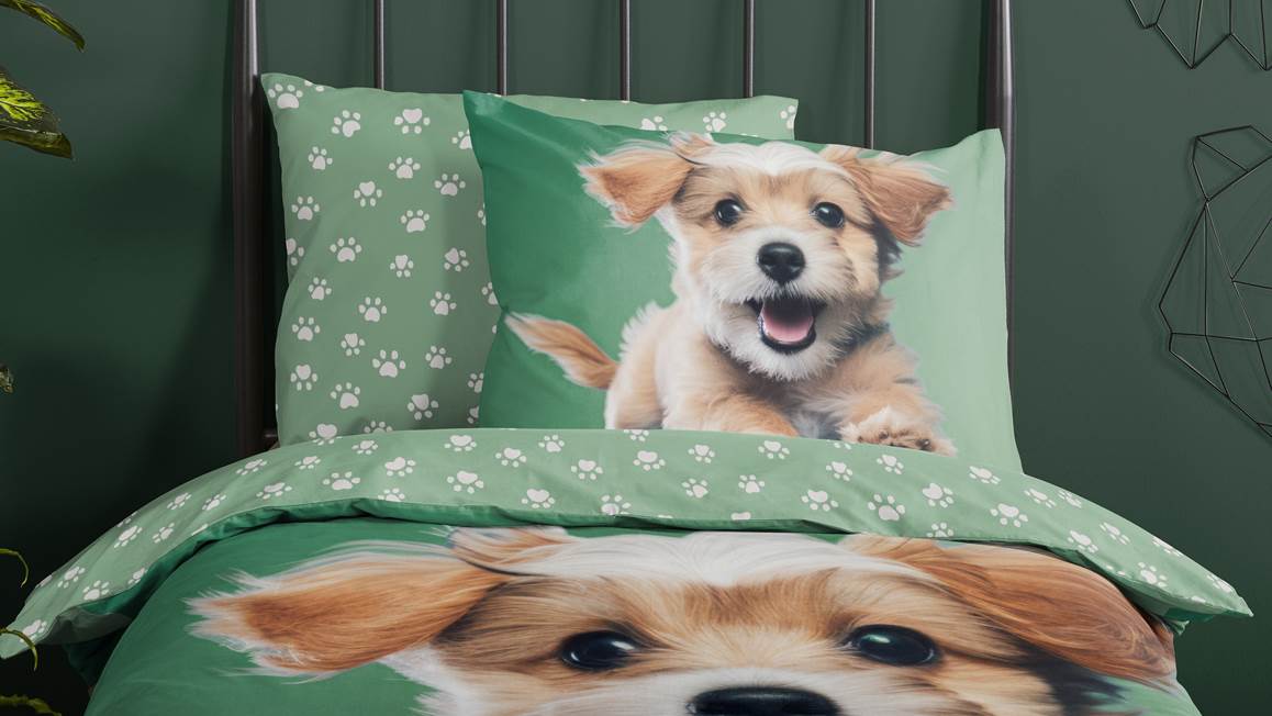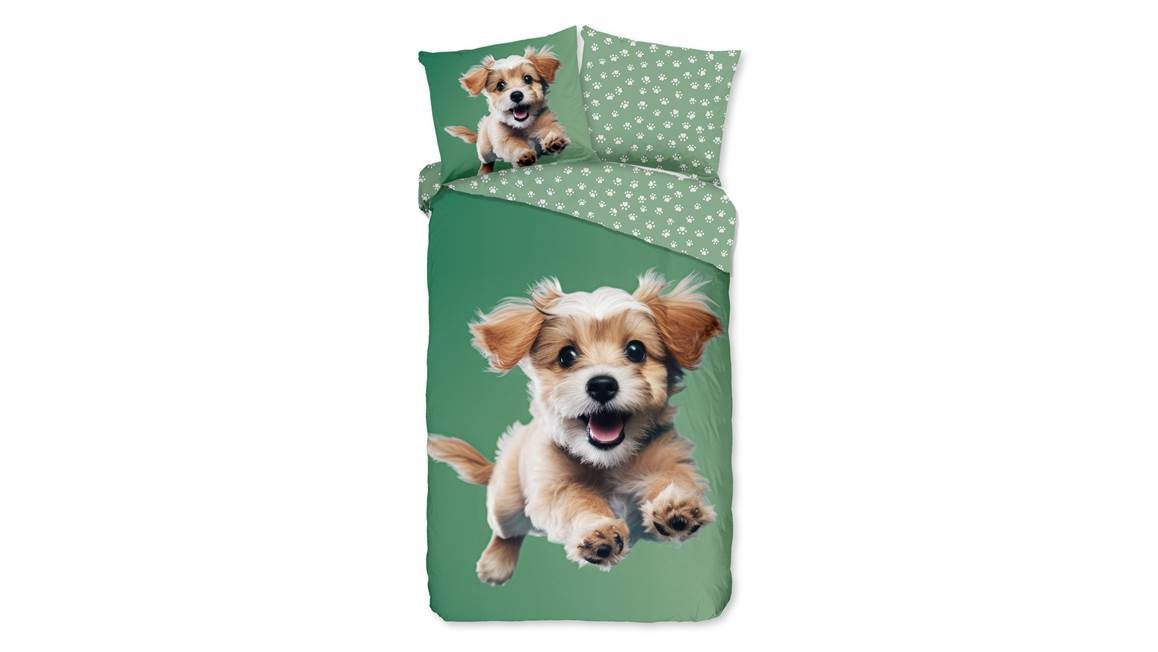 Het Good Morning Mambo dekbedovertrek vrolijkt iedere slaapkamer van de hondenliefhebber op. Op het groene overtrek zie je een hondje vrolijk op je af komen springen. Het diertje ziet er ontzettend schattig uit met zijn bruine vlekjes en het tongetje uit zijn bekje. Op de achterkant staat een print van hondenpootjes. Hierdoor kun je leuk afwisselen tussen beide prints.