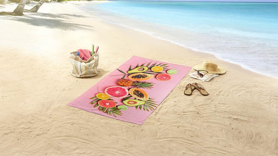 Een strandlaken met tropische print neem je natuurlijk mee op een zwemvakantie. Het Pink Fruits strandlaken heeft een gave fotoprint van diverse exotische vruchten. Zo zie je een ananas, avocado’s, papaja’s en diverse citrusvruchten op een lichtroze achtergrond. De frisse kleuren laten het badlaken opvallen waardoor je deze eenvoudig terugvindt op het drukke strand.