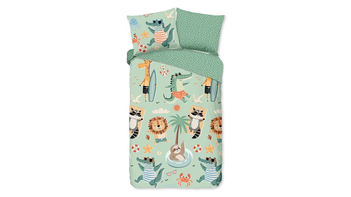 Het Good Morning Soleil dekbedovertrek is een vrolijke toevoeging aan iedere kinderkamer. Het groene dessin ziet er erg zomers uit door de verschillende dieren met een zonnebril of een zwembroek. Maak je klaar voor de leukste dromen op het strand met de nieuwe dierenvriendjes. De zwembanden, palmbomen en zeesterren, maken het zomerse tafereel helemaal compleet.