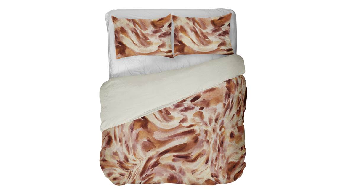 Creëer een warm en sfeervol geheel in de slaapkamer met het Futo dekbedovertrek van het duurzame merk Kayori. De grafische print is opgebouwd uit verschillende organische vergen in diverse bruintinten. De combinatie met de nude en beige zorgt dat het ontwerp een frisse touch krijgt. Maak daarnaast met de romige offwhite achterzijde een contrasterende omslag.