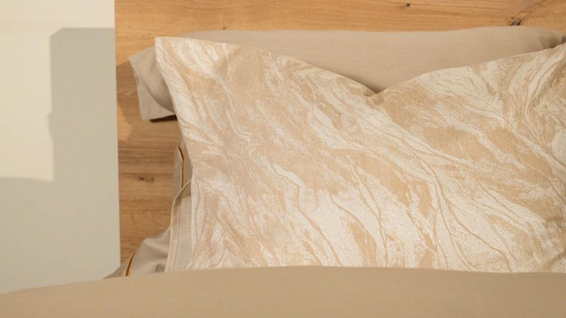 Creëer een oase aan rust in de slaapkamer met het Kayori Nachi dekbedovertrek. Het zandkleurige dessin bevat een grafische print die erg tijdloos is. De tinten vervagen en lopen subtiel in elkaar over, waardoor er een marmeren effect ontstaat. Zo ontstaat er een eigentijds geheel. De achterzijde is effen van kleur, zodat je een luxe en strakke omslag kunt creëren.