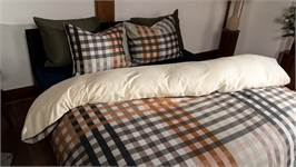 Het Kayori Taru dekbedovertrek bevat een tijdloze ruitenprint. Het ruitenpatroon bestaat uit zwarte, grijze, bruine en witte tinten. Deze kleurcombinatie zorgt voor een warme sfeer in de slaapkamer. Sla het overtrek een stukje om en creëer een luxueuze omslag. De achterzijde is effen van kleur. Beide prints lopen door op de bijbehorende kussenslopen.