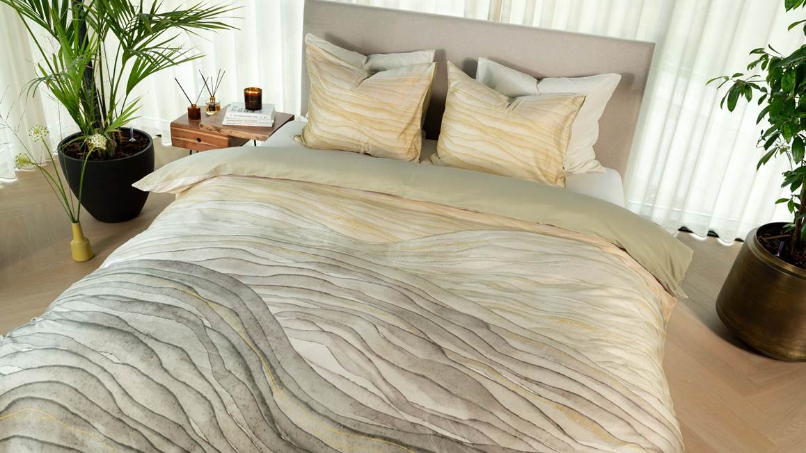 Droom iedere avond heerlijk weg onder het Kayori Zaki dekbedovertrek. Het bergachtige landschap is op een grafische manier weergegeven, waardoor het er erg artistiek uitziet. De beige tinten in combinatie met grijs en groen zorgen voor een serene en ontspannen sfeer. Voor een luxe effect kun je het overtrek een stukje openslaan en met de effen achterzijde een omslag creëren. Of wissel af tussen beide kanten en kies zelf voor de stijl in jouw slaapkamer.