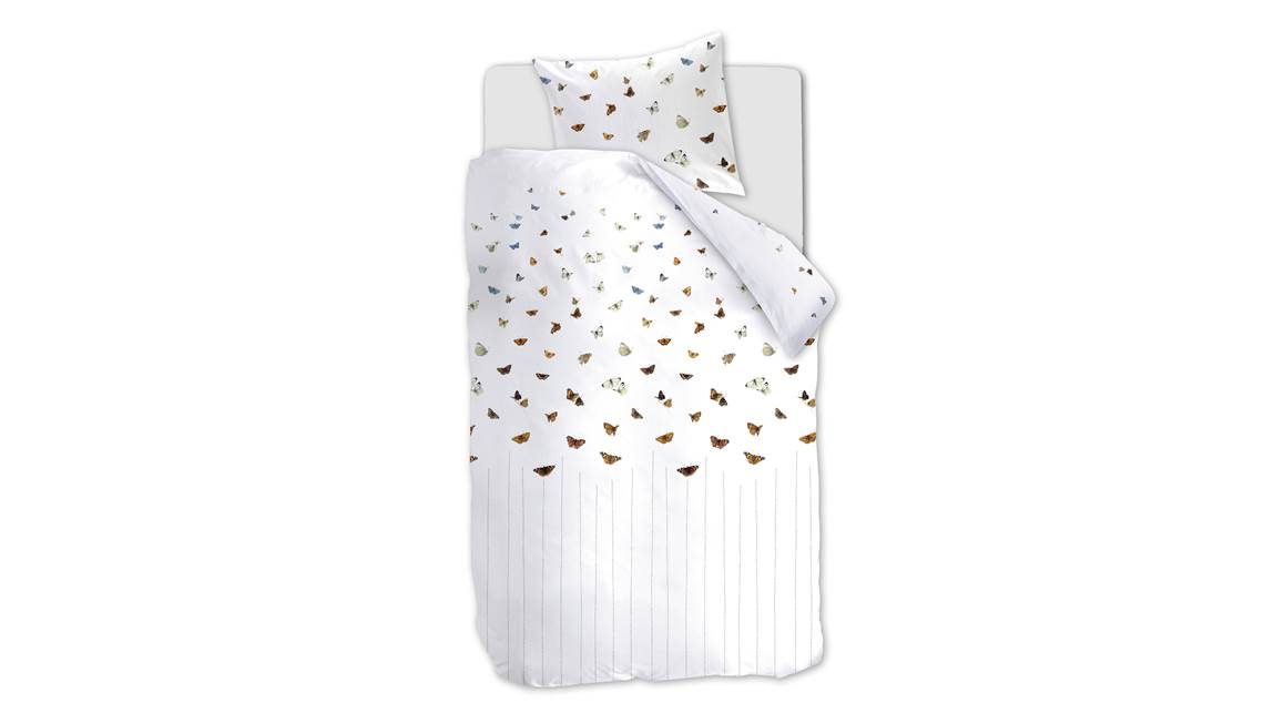 Houd jij van beddengoed met een speelse print? Dan is het Mariposa dekbedovertrek écht iets voor jou! Vlinders in verschillende kleuren en groottes fladderen over het witte dessin. Door de witte ondergrond komen de kleuren prachtig uit. Aan de onderkant van het overtrek zitten diverse stippellijnen om het ontwerp compleet te maken. Ook op de kussenslopen fladderen de vlinders vrolijk door elkaar heen.