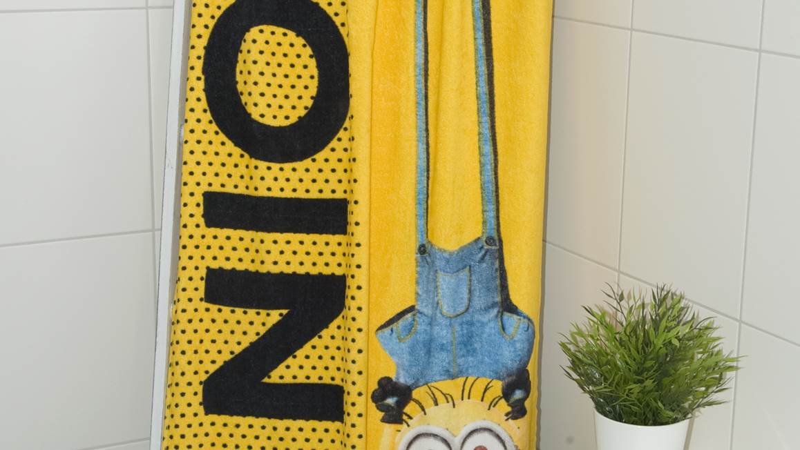 Wie kent de Minions niet? De vrolijke gele figuren weten ieder kind blij te maken. Is jouw kindje ook helemaal weg van de Minions? Dan kan het Minions strandlaken niet ontbreken in de zwemtas. Op het gele strandlaken zie je een minion hangen terwijl een ander aan de broek hangt, waardoor de bovenste minion in zijn onderbroek hangt. Aan de zijkant staat groot in zwarte letters 'Minions'.