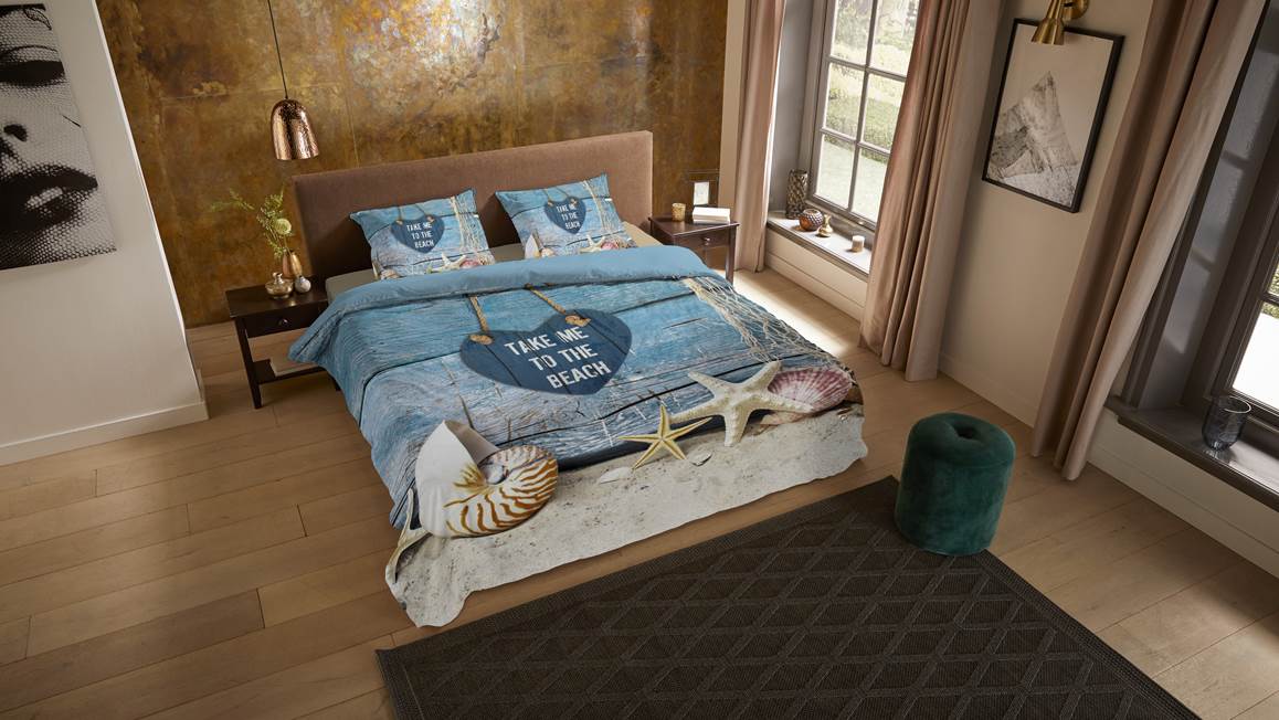 Met het Pure Beach dekbedovertrek krijg je direct zin in een stranddagje. Het dessin bevat een fotoprint van een bordje met daarop de tekst 'Take me to the beach'. Onder het houten hart liggen schelpen en zeesterren in het zand. Hierdoor krijg je direct het idee dat je op het strand bent. De achterzijde van het overtrek is effen blauw, zodat je een leuke omslag kunt creëren. De bijbehorende kussenslopen hebben aan de voorkant dezelfde fotoprint en zijn aan de achterzijde ook effen blauw.