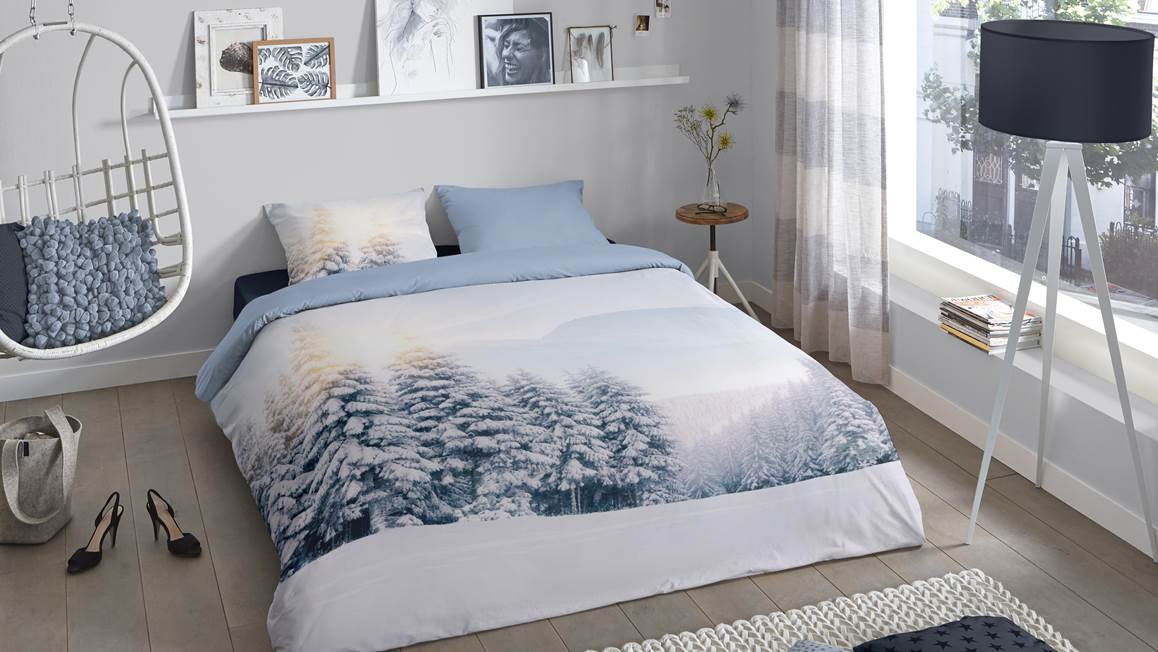 Met het Winter View dekbedovertrek van Pure tover je de slaapkamer in een handomdraai om in een sneeuwlandschap. De besneeuwde dennenbomen lopen zover je kunt kijken. Tussen de bomen door schijnt de zon je tegemoet. Met de bergen op de achtergrond waan je jezelf op wintersport. De achterzijde van het overtrek is lichtblauw wat mooi aansluit bij de rustige natuurprint aan de voorzijde.
