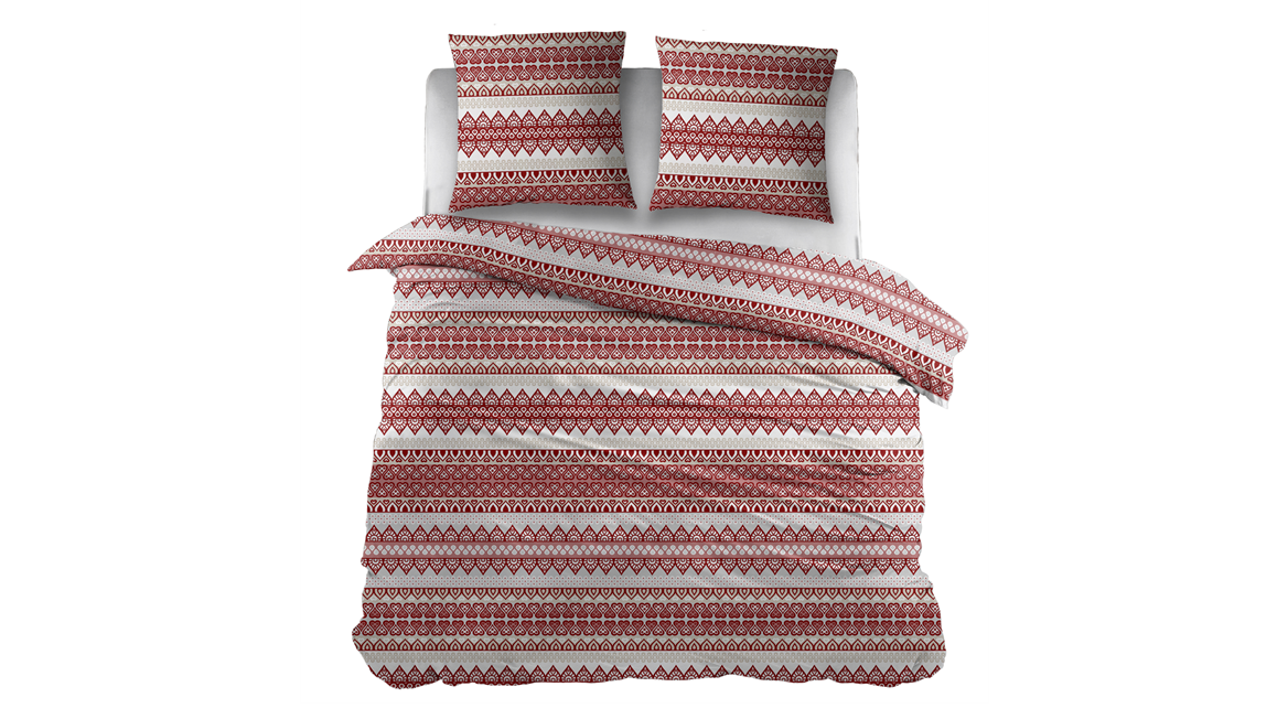 Onder het Snoozing Kristel dekbedovertrek val je iedere avond heerlijk in slaap. De rode geometrische print is erg stijlvol en trendy. Diverse patronen wisselen elkaar af, waardoor er een speels geheel ontstaat. De bordeauxrode tint komt prachtig uit op de witte ondergrond. De print is dubbelzijdig gedrukt en lopen door op de bijbehorende kussenslopen.