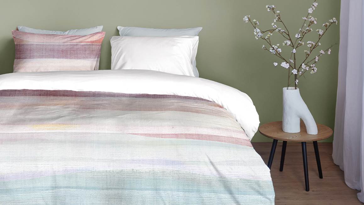 Geef jouw slaapkamer een vrolijke en kleurrijke touch met het Snoozing Wisp dekbedovertrek. Het ontwerp bestaat uit grafische strepen in zachte pasteltinten. Deze lopen over van roze naar lichtblauw. Doordat het net lijkt alsof ze met waterverf geschilderd zijn, ziet het geheel er erg artistiek uit. Met de effen witte achterzijde creëer je een strakke omslag. Ook kun je afwissel tussen beide prints voor een frisse Scandinavische look. De bijbehorende kussenslopen bevatten beide prints om de look compleet te maken.