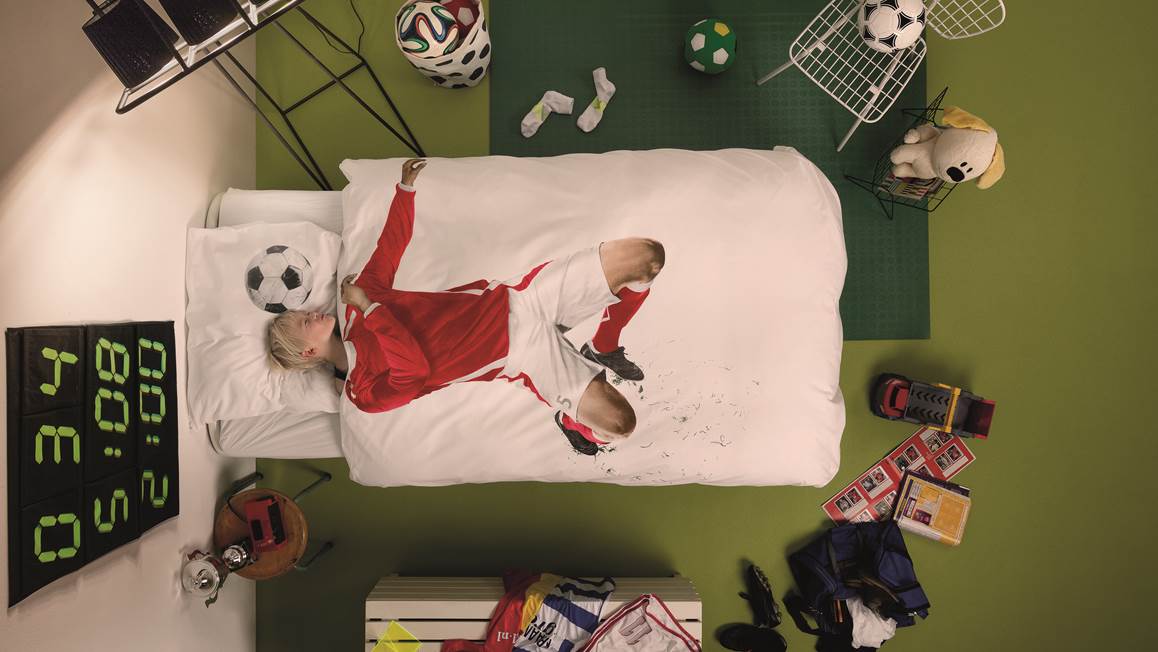 Ook met dit dekbedovertrek heeft SNURK weer gescoord! Op het witte overtrek is een super leuke print gevonden van een voetballer met een rood voetbaltenue. Op de bijpassende kussensloop is de voetbal gedrukt, zodat ook jij de bal in het goal kan koppen.